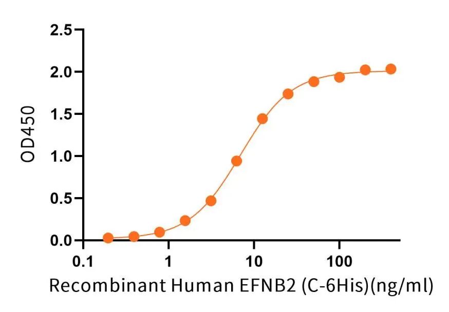 Immobilized Recombinant Nipah Virus G Protein(DRA265) at 2 μg/ml (100 μl/well) can bind Recombinant Human EFNB2 (C-6His)(C465)*. *: Biotinylated by NHS-biotin prior to testing.The ED50 of Recombinant Human EFNB2 (C-6His)(C465) is 6.92ng/ml.(Regularly tested)